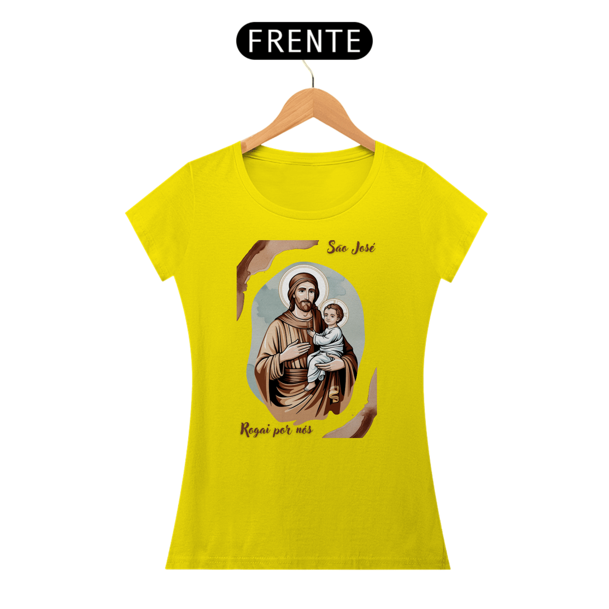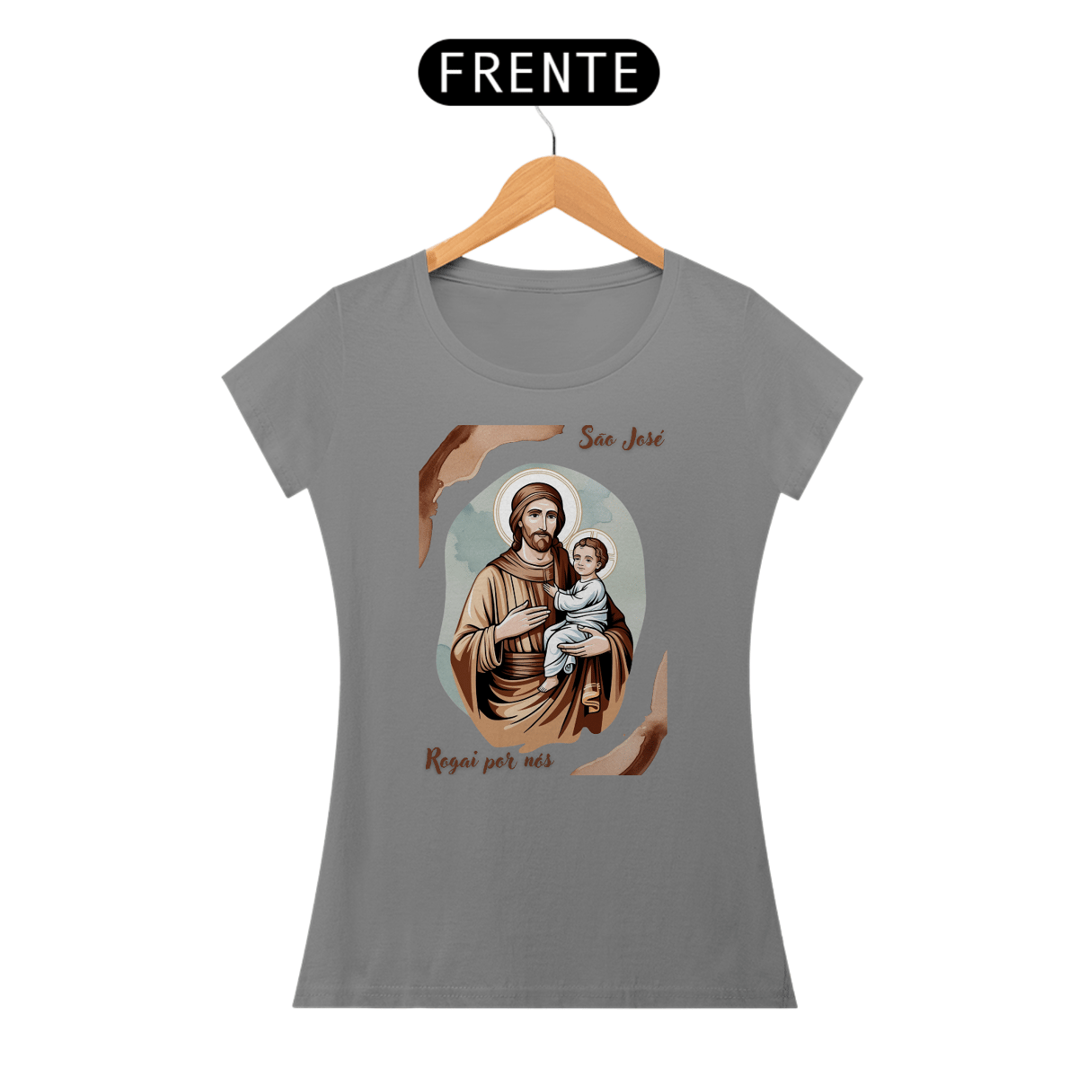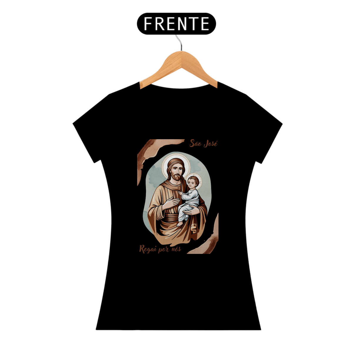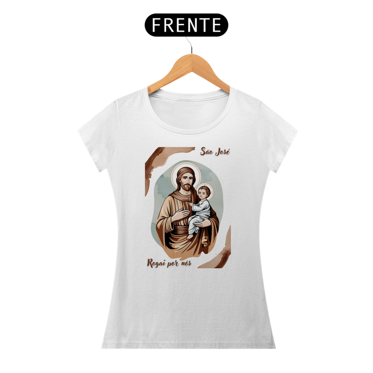 Esta baby look é uma homenagem delicada e moderna a São José, patrono das famílias e modelo de virtude. A peça apresenta uma imagem artística de São José com o menino Jesus, perfeita para expressar sua fé e devoção.