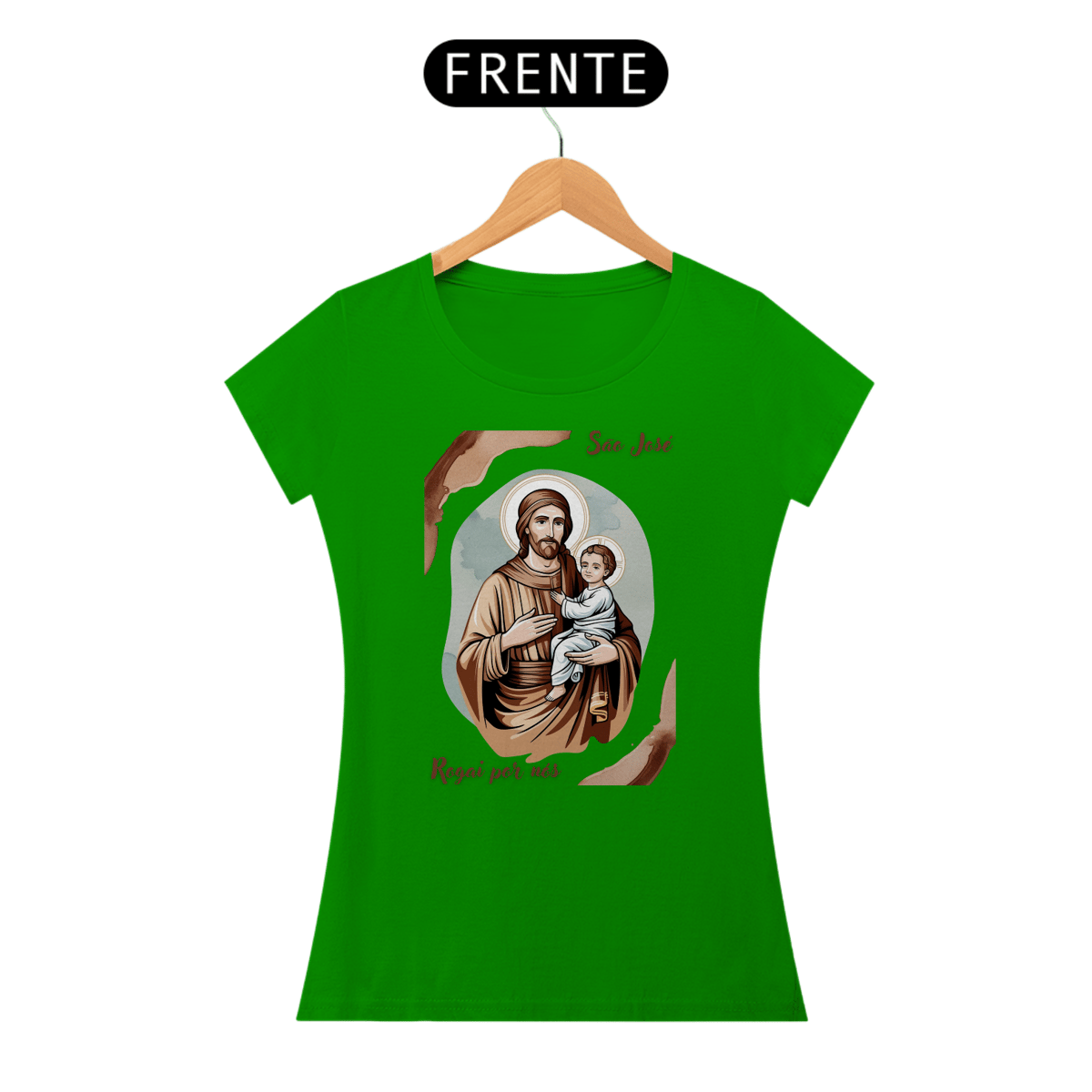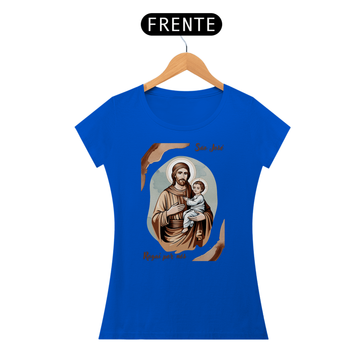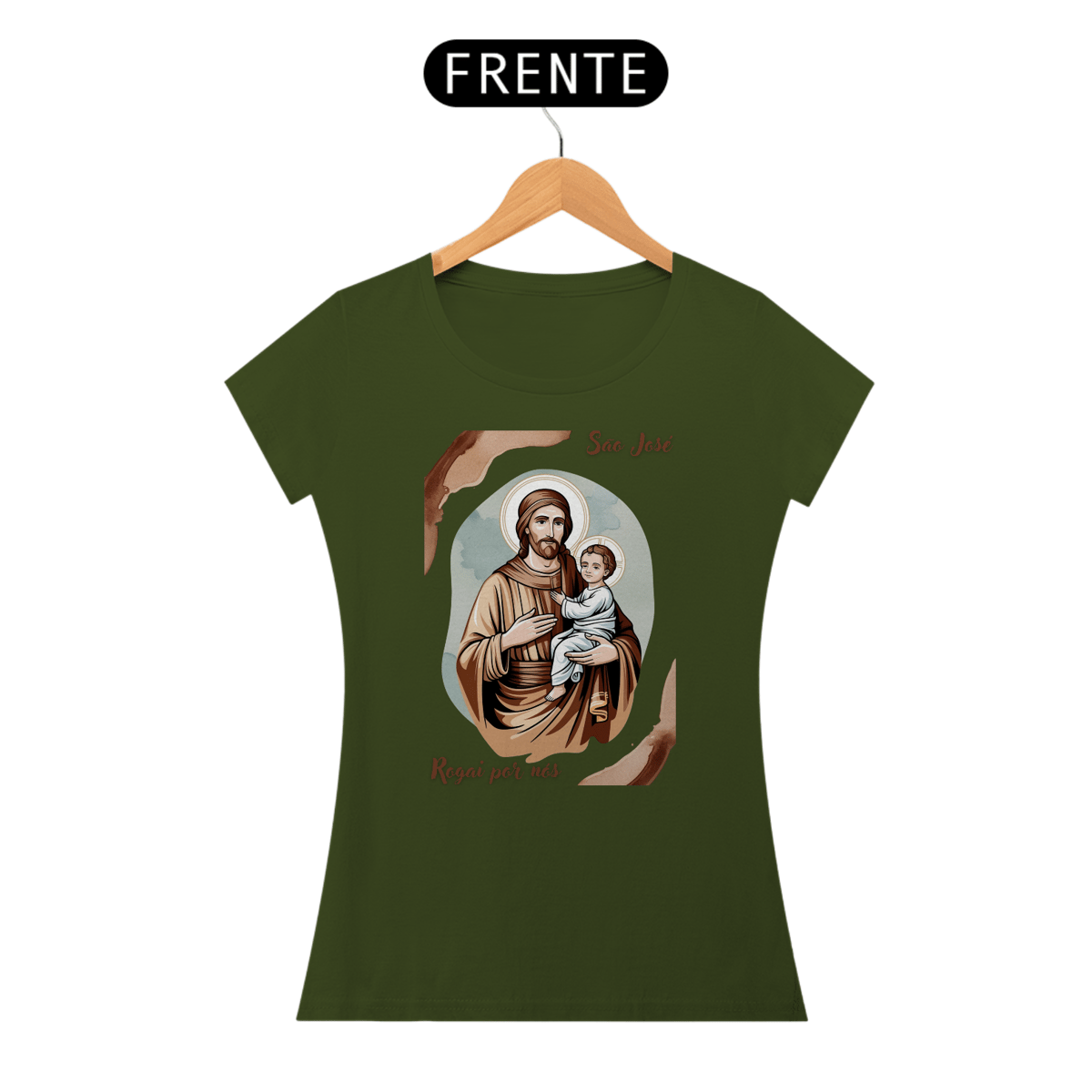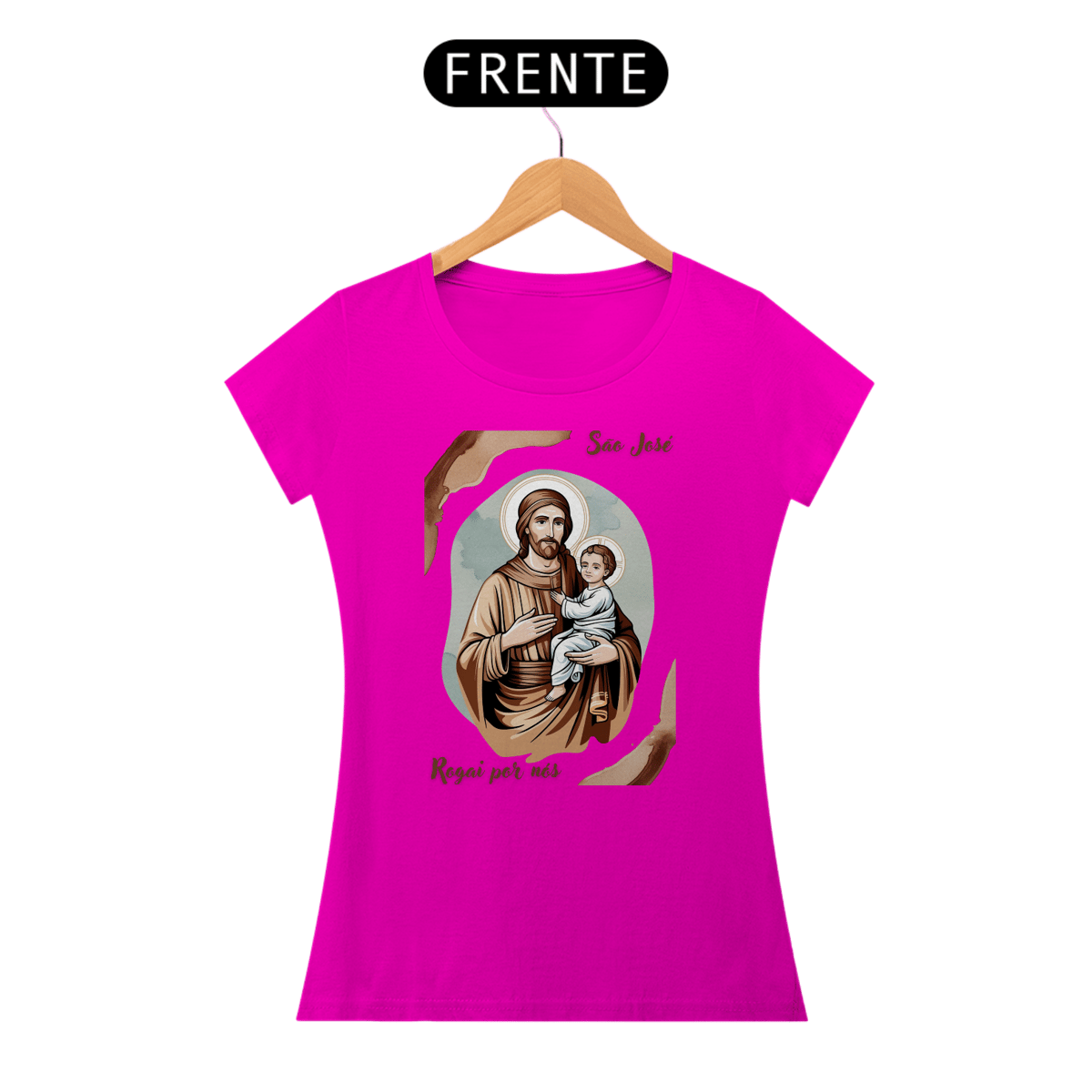 Esta baby look é uma homenagem delicada e moderna a São José, patrono das famílias e modelo de virtude. A peça apresenta uma imagem artística de São José com o menino Jesus, perfeita para expressar sua fé e devoção.