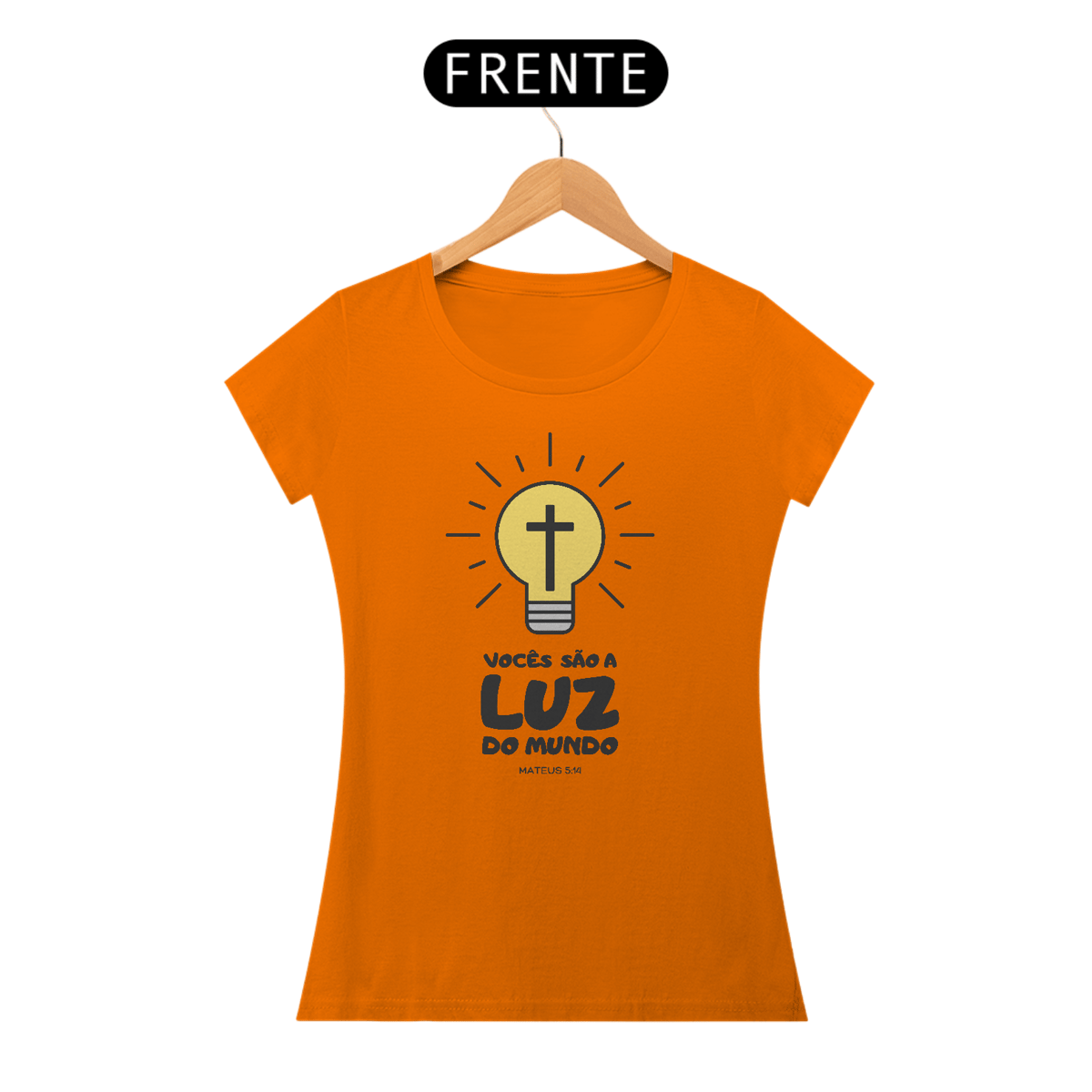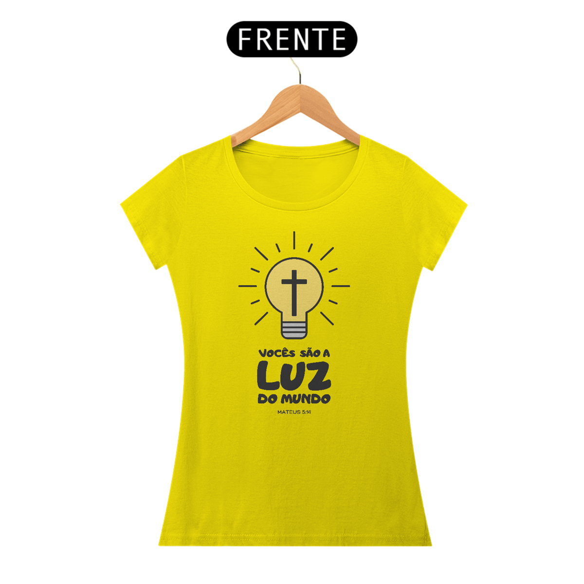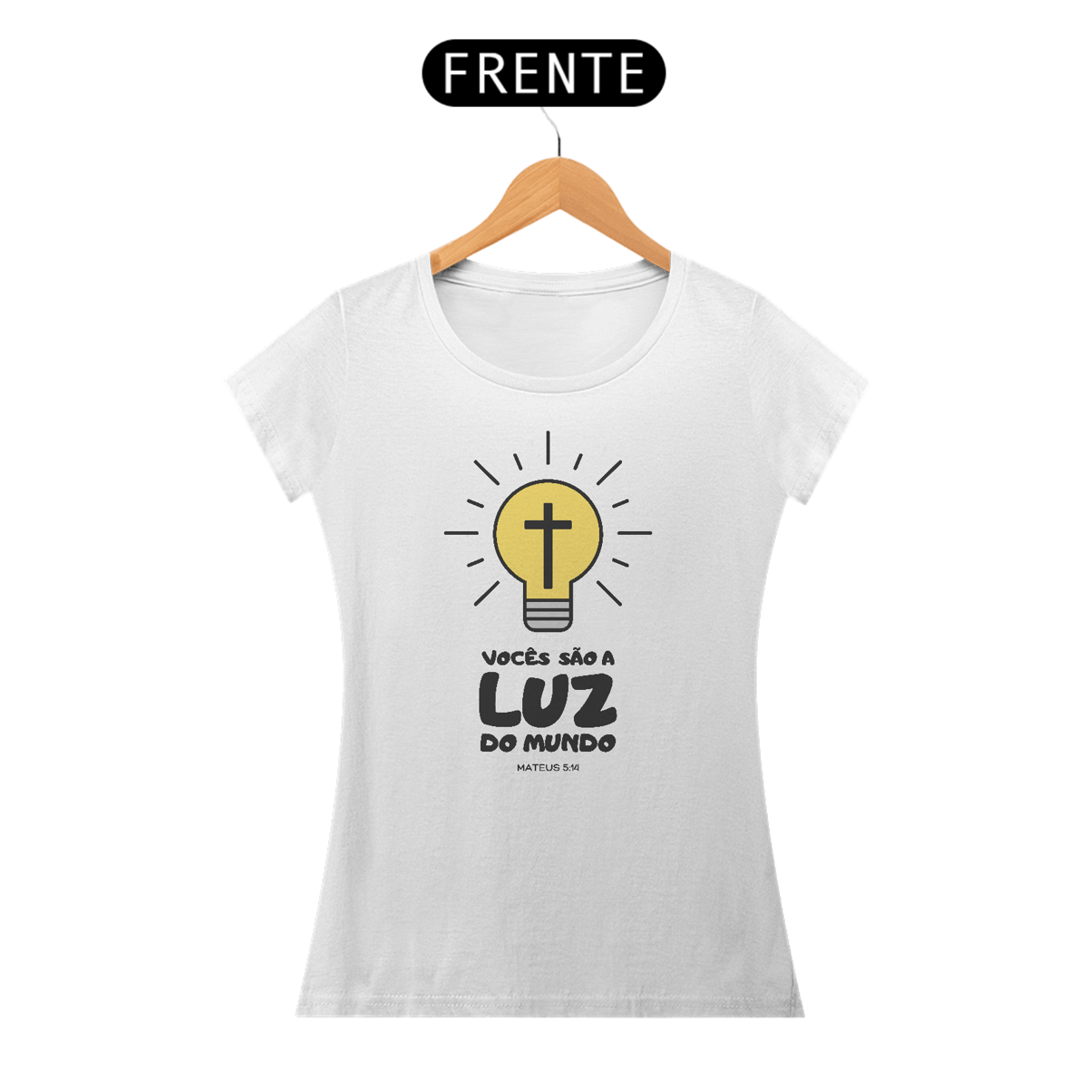 Leve sua fé para o dia a dia com a baby look "Vocês São a Luz do Mundo". Feita para quem deseja destacar sua espiritualidade, esta peça combina conforto, elegância e uma poderosa mensagem de Mateus 5:14. O design, com luz irradiando de uma lâmpada central, simboliza a importância de ser um reflexo da luz de Cristo no mundo.