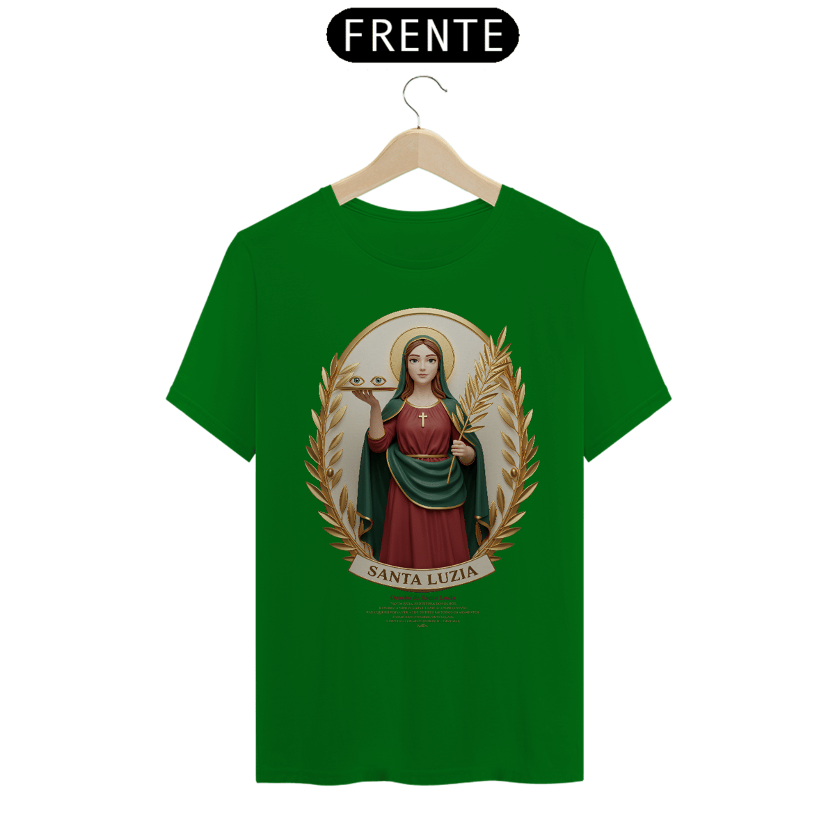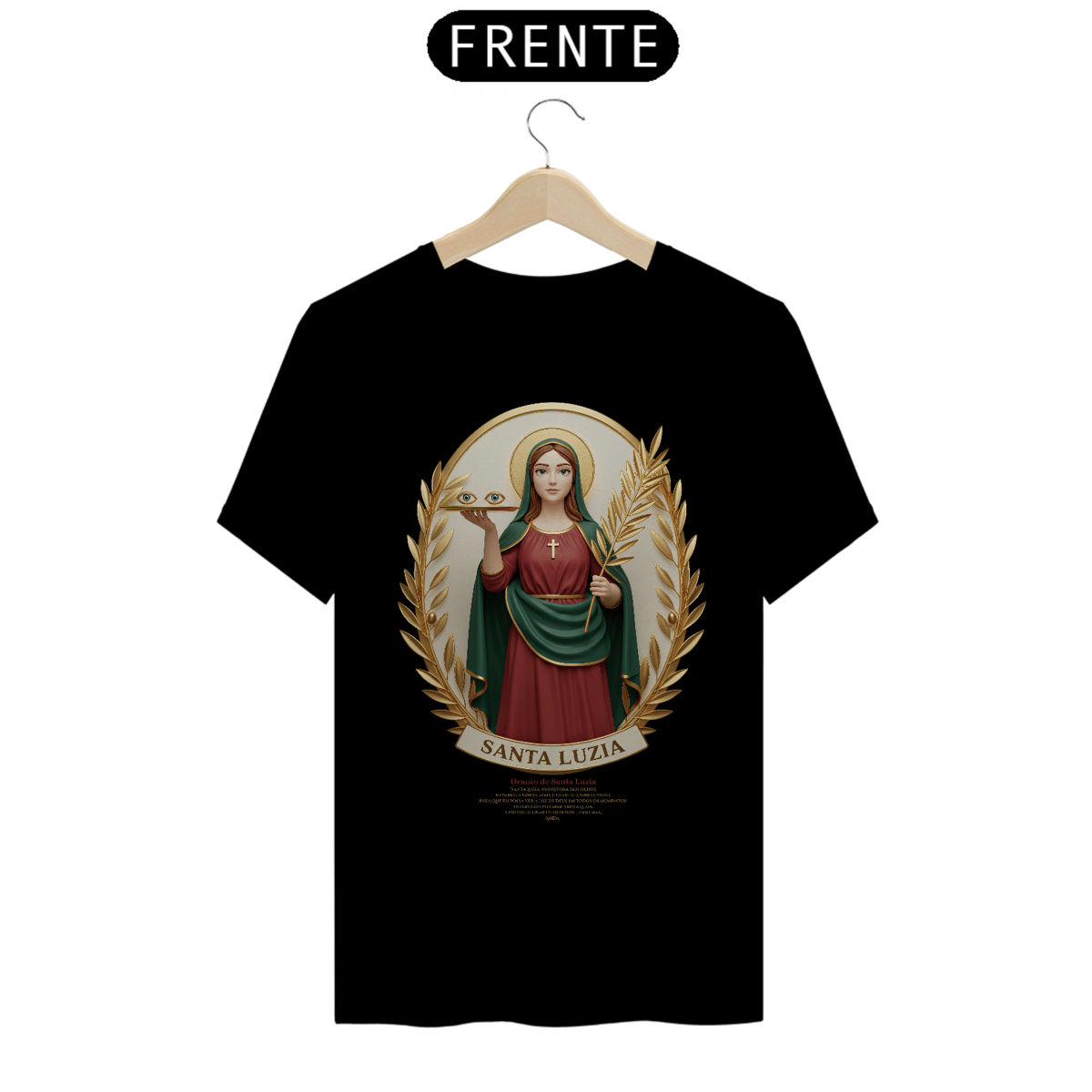 Uma homenagem especial à Santa Luzia, protetora dos olhos e símbolo de fé e esperança. Esta camiseta traz uma estampa detalhada com a imagem de Santa Luzia, acompanhada da sua bela oração, perfeita para quem busca sua intercessão e proteção.