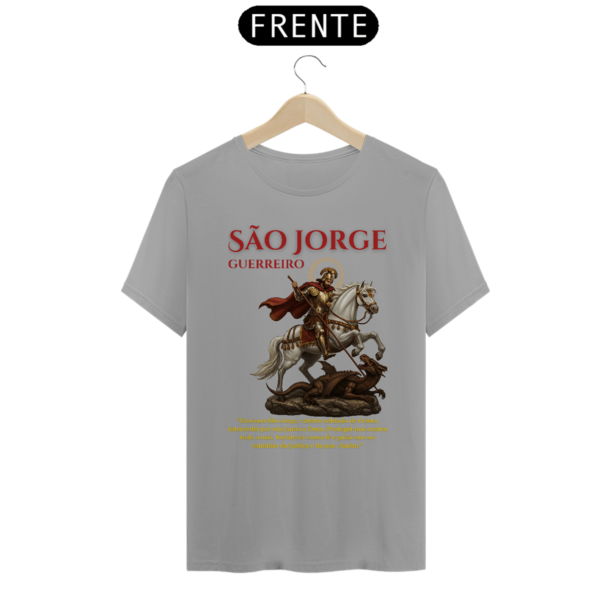 Homenageie a força e a coragem de São Jorge Guerreiro com esta camiseta especial. A estampa apresenta uma arte vibrante de São Jorge enfrentando o dragão, acompanhada da poderosa oração:
