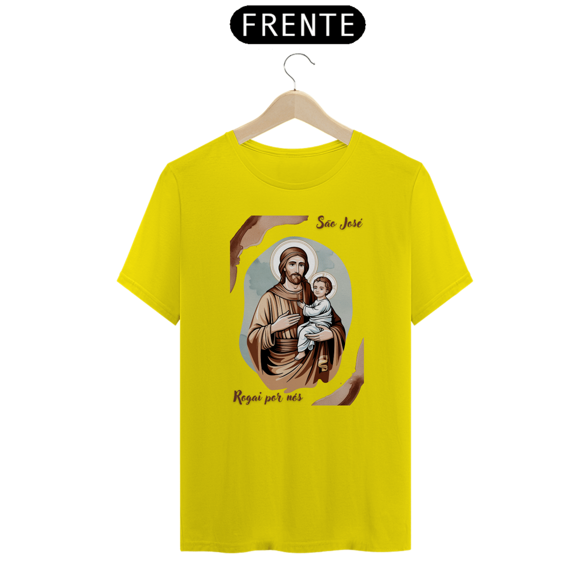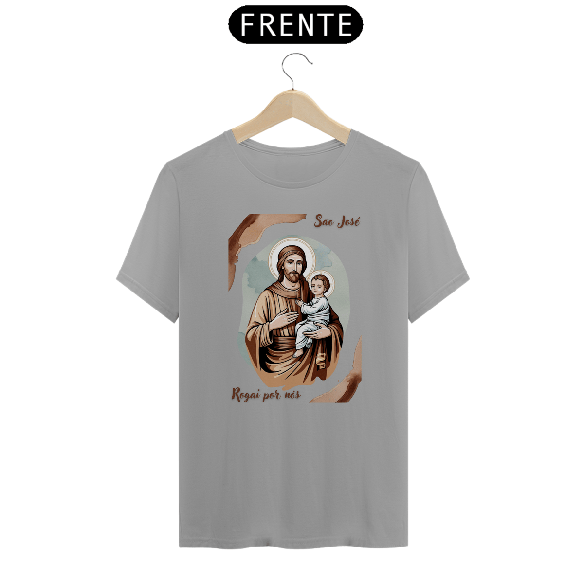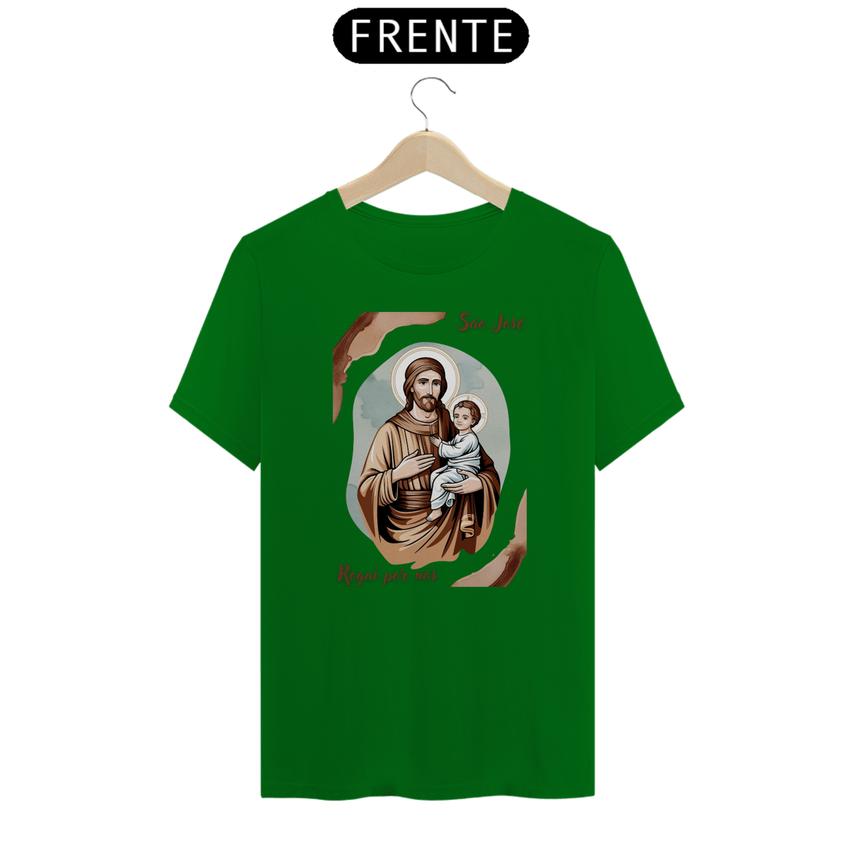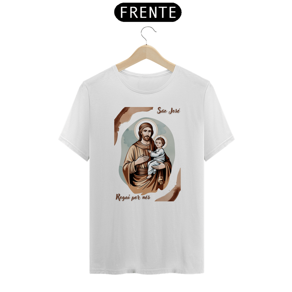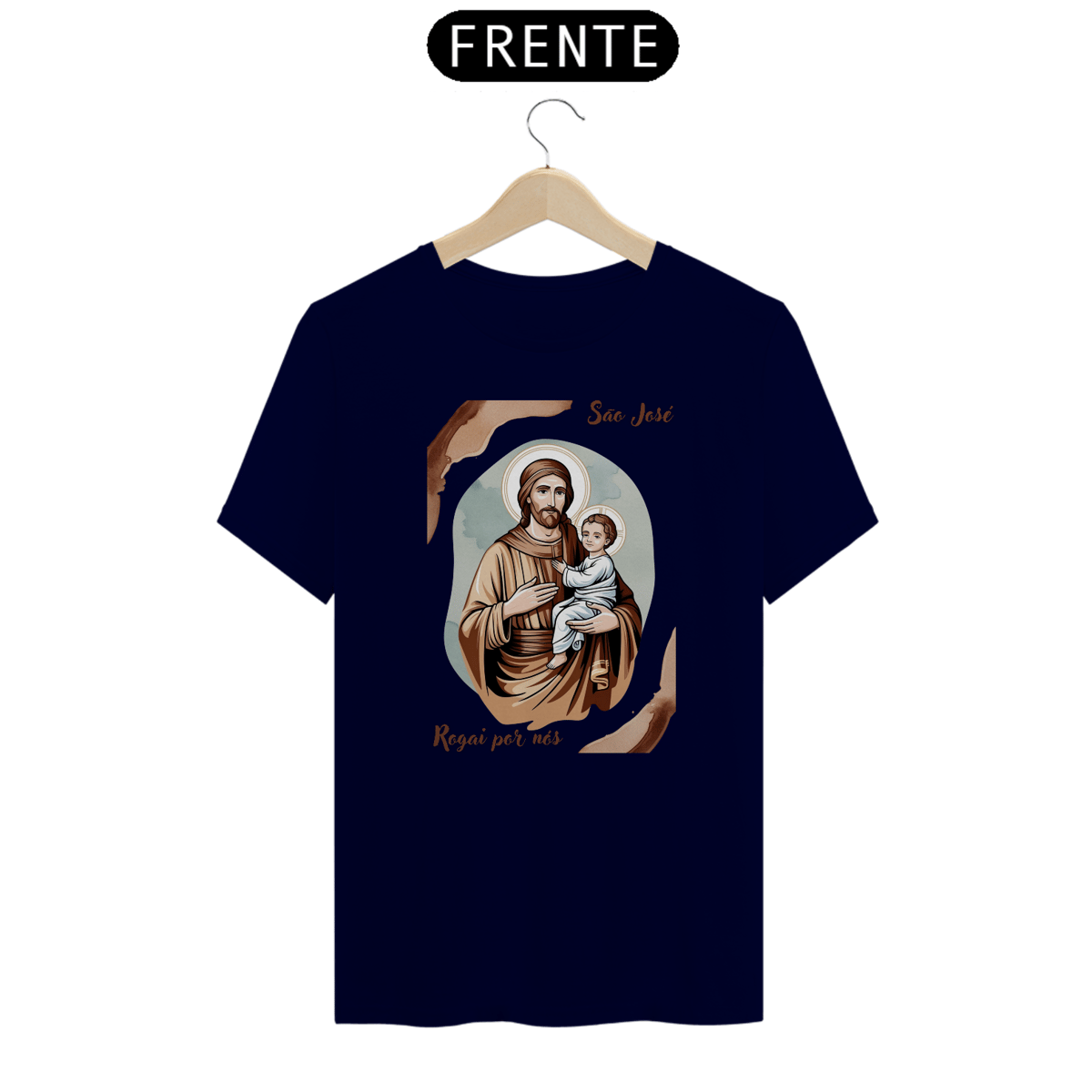 Uma belíssima homenagem a São José, o protetor das famílias e exemplo de humildade e dedicação. Esta camiseta apresenta uma imagem detalhada de São José segurando o menino Jesus, simbolizando proteção, amor e fé.
